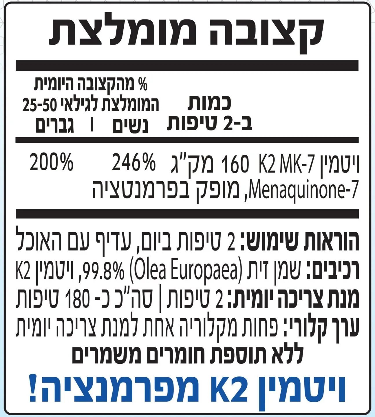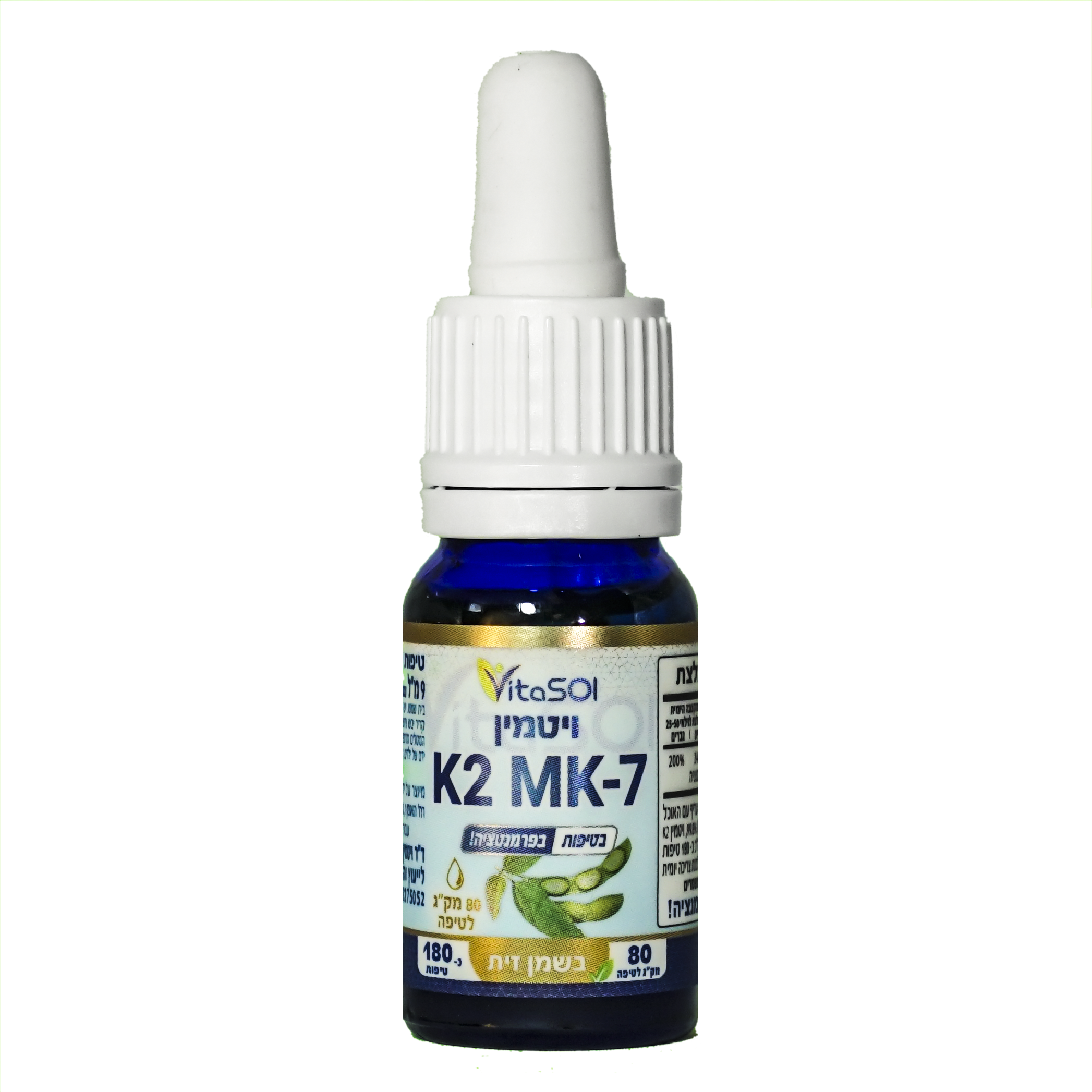 כל טיפה מספקת 80 מק"ג ויטמין K2. סה"כ 180 טיפות.