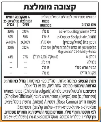 - פורמולת "אנמיה" מתקדמת שמבוססת על חוד החנית של המחקר והמדע בעולם, שמציגה נחושת, B12 ו- B9, נוסף על הברזל. לרכיבים סינרגייה מובנה, והם ביחסים ומינונים מדודים ומותאמים.