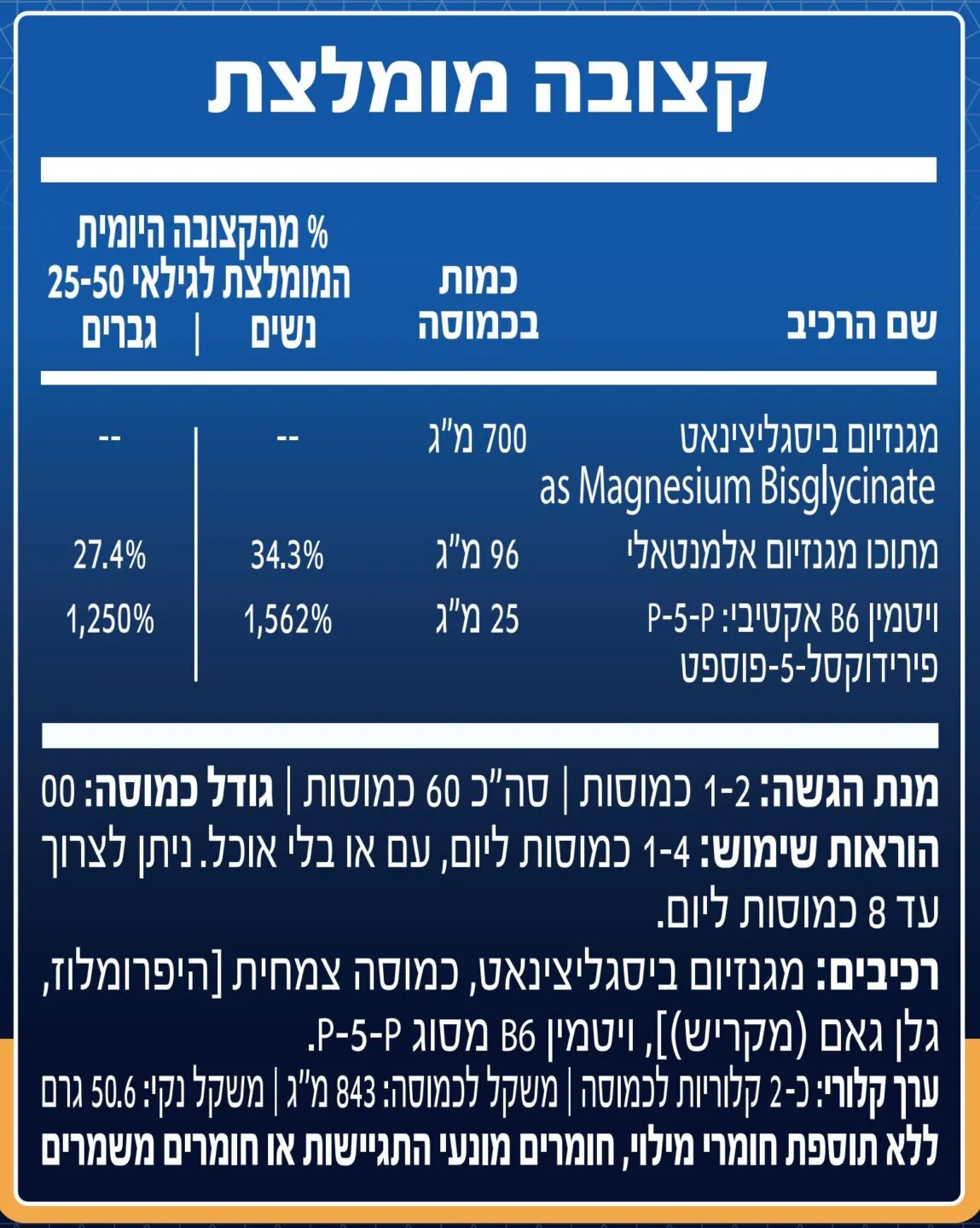 מכיל 96 מ"ג מגנזיום ביסגליצינאט נקי – שאינו מדולל באוקסיד