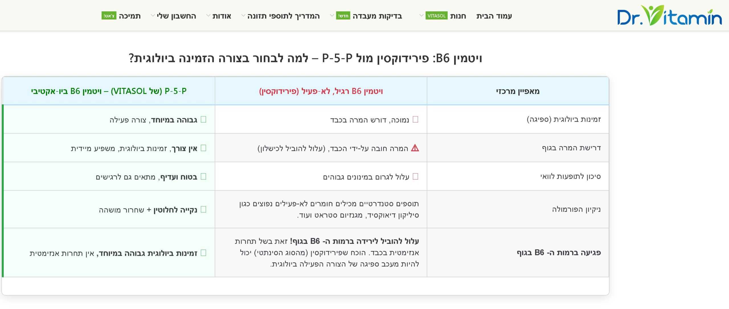 | מאפיין מרכזי | ויטמין B6 רגיל, לא-פעיל (פירידוקסין) | P-5-P (של VitaSOl) – ויטמין B6 ביו-אקטיבי |