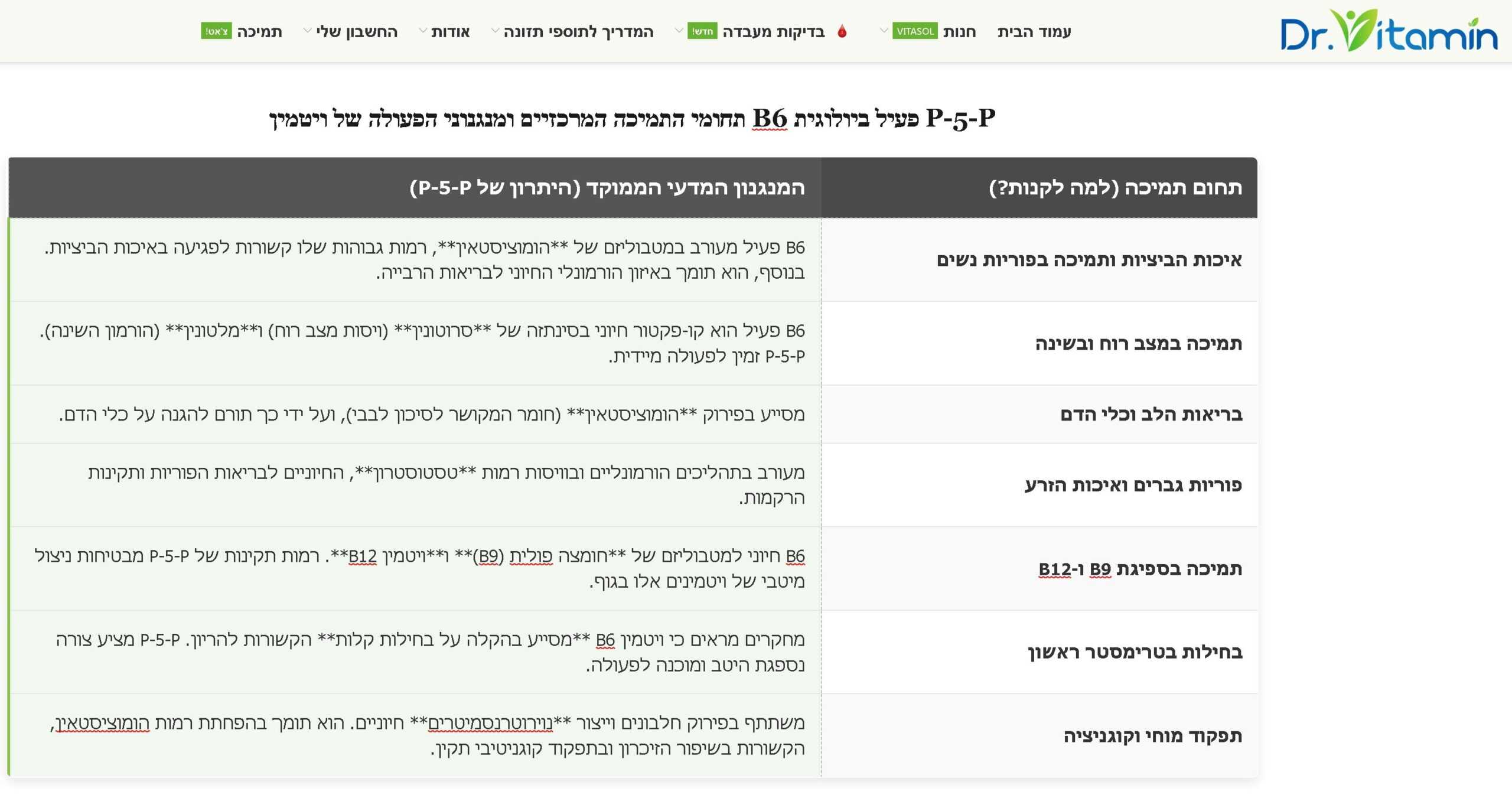 תחומי התמיכה המרכזיים ומנגנוני הפעולה של ויטמין B6 פעיל ביולוגית (P-5-P)